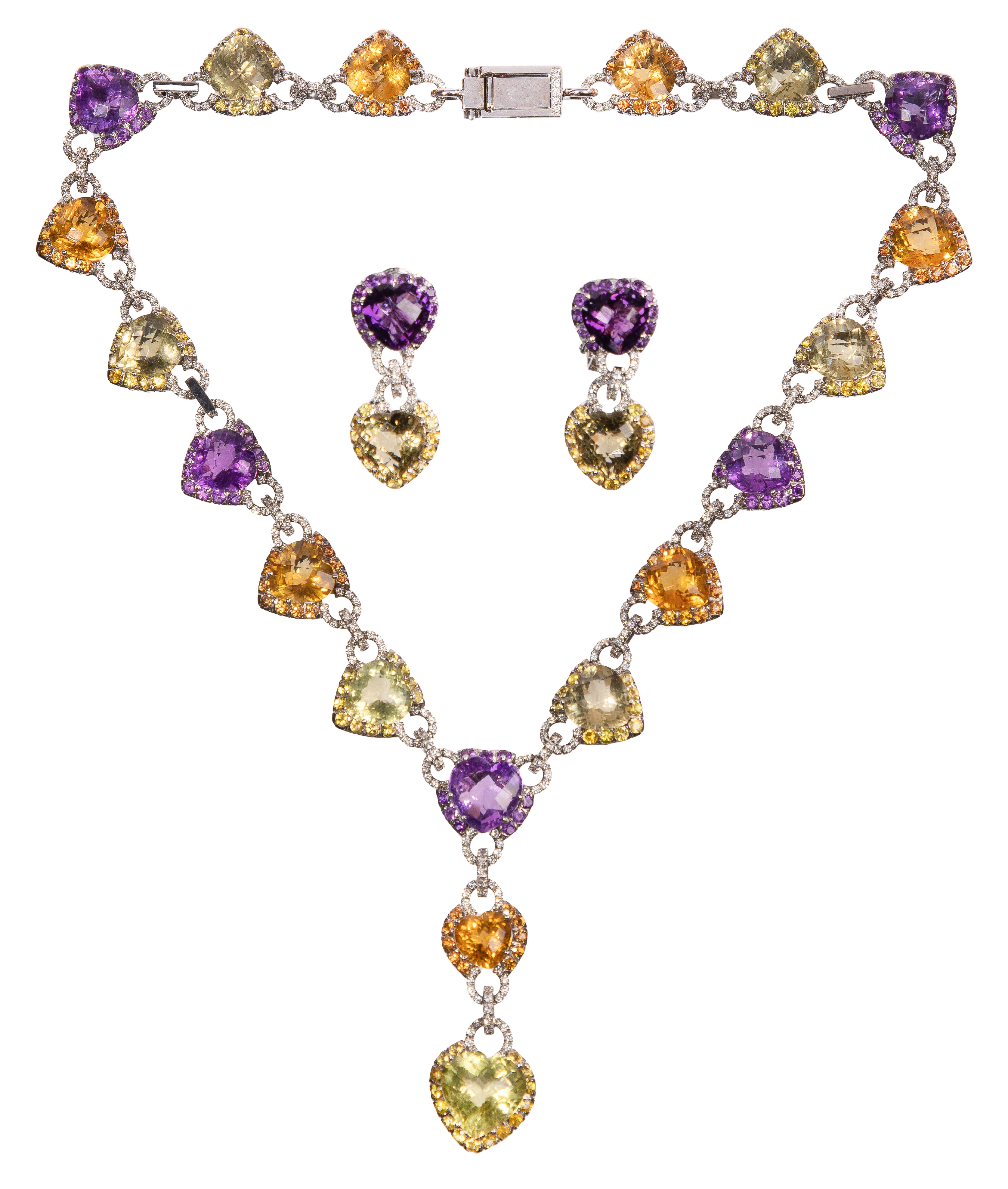 18k White Gold, Lemon Quartz, Amethyst, Citrine and Diamond Necklace and Earrings
